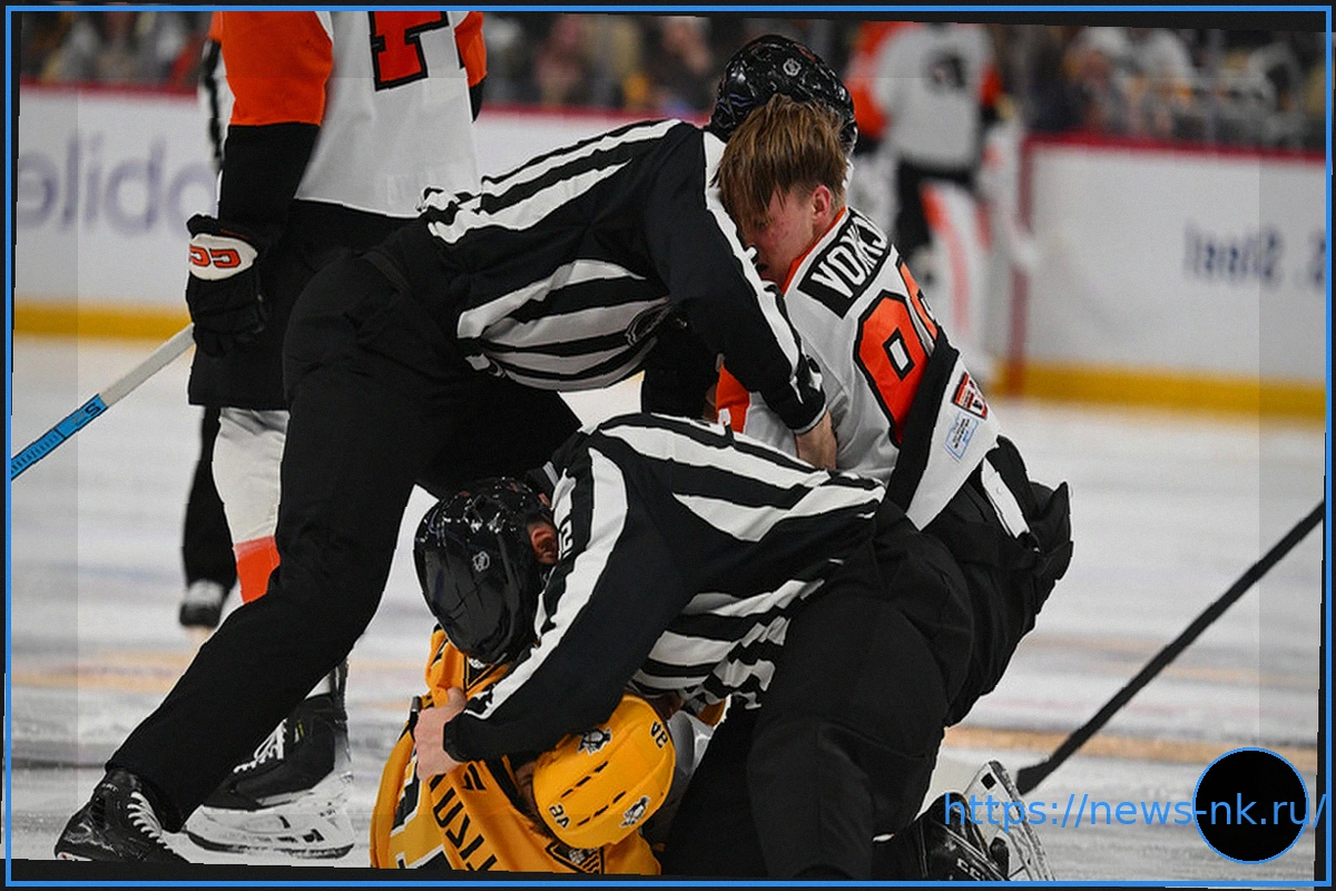 В разгар третьего матча первого раунда плей-офф НХЛ между командами «Филадельфия» и «Питтсбург» в начале второго периода произошел крупный инцидент: вспыхнула массовая потасовка. Российский нападающий «летчиков» Матвей Мичков принял активное участие в этой стычке.